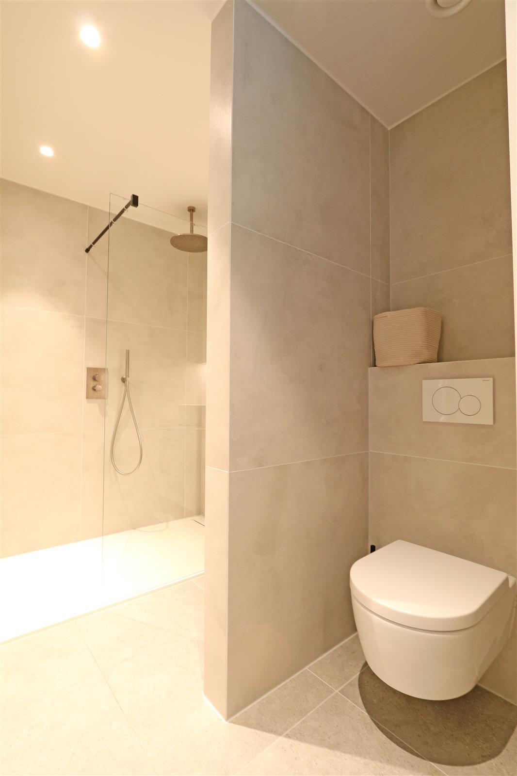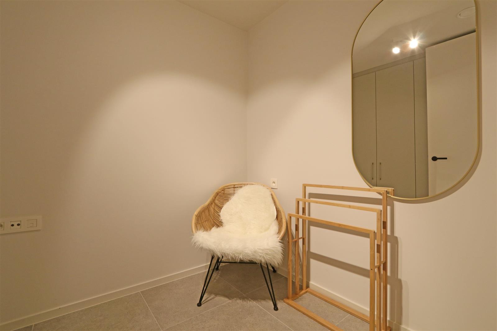 Modern nieuwbouwappartement met een dubbele kamer met ensuite badkamer met lavabo, inloopdouche en toilet. Er is een 2de kamer met stapelbed en bureau en een 2de douchekamer.