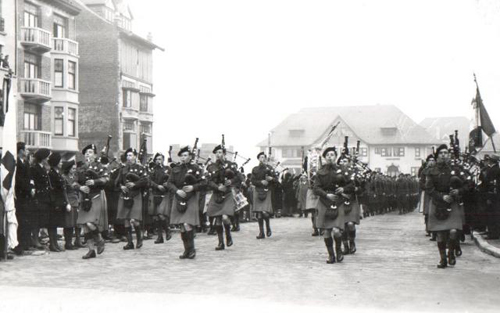 Bevrijding op 1 en 2 november 1944Knokke en Heist werden op 1 en 2 november 1944 bevrijd door de 9de Canadese Infanterie Brigade na drie weken hevige strijd in de West Zeeuws-Vlaamse polders. Knokke bleef gelukkig gespaard van bombardementen. Precies één jaar later werd de 1ste Herdenking van de Bevrijding herdacht. De Canadese eenheden bevonden zich toen nog in Friesland-Nederland. Een delegatie officieren en soldaten werd uitgenodigd voor de herdenkingsplechtigheden in Knokke. Er kwam ook een Pipes Band om de Canada Square bij het Stedelijk Casino in te huldigen. |