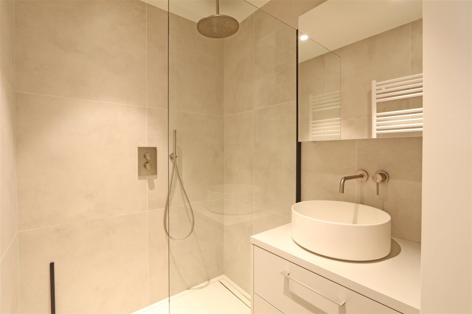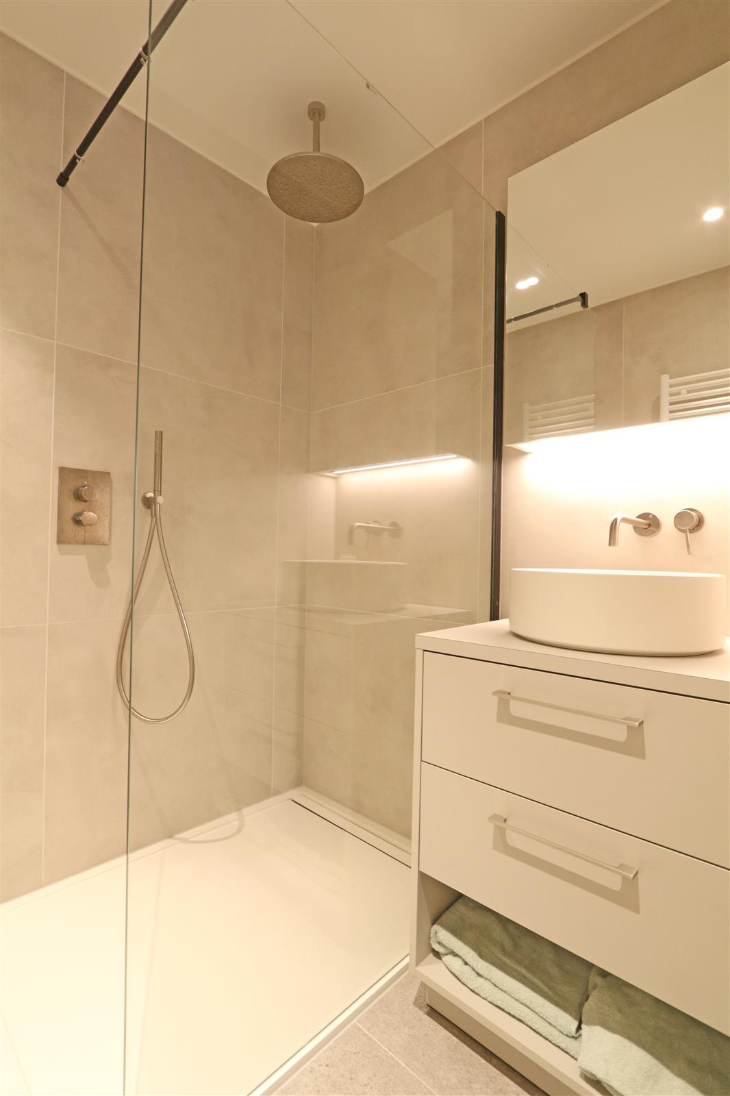 Modern nieuwbouwappartement met een dubbele kamer met ensuite badkamer met lavabo, inloopdouche en toilet. Er is een 2de kamer met stapelbed en bureau en een 2de douchekamer.