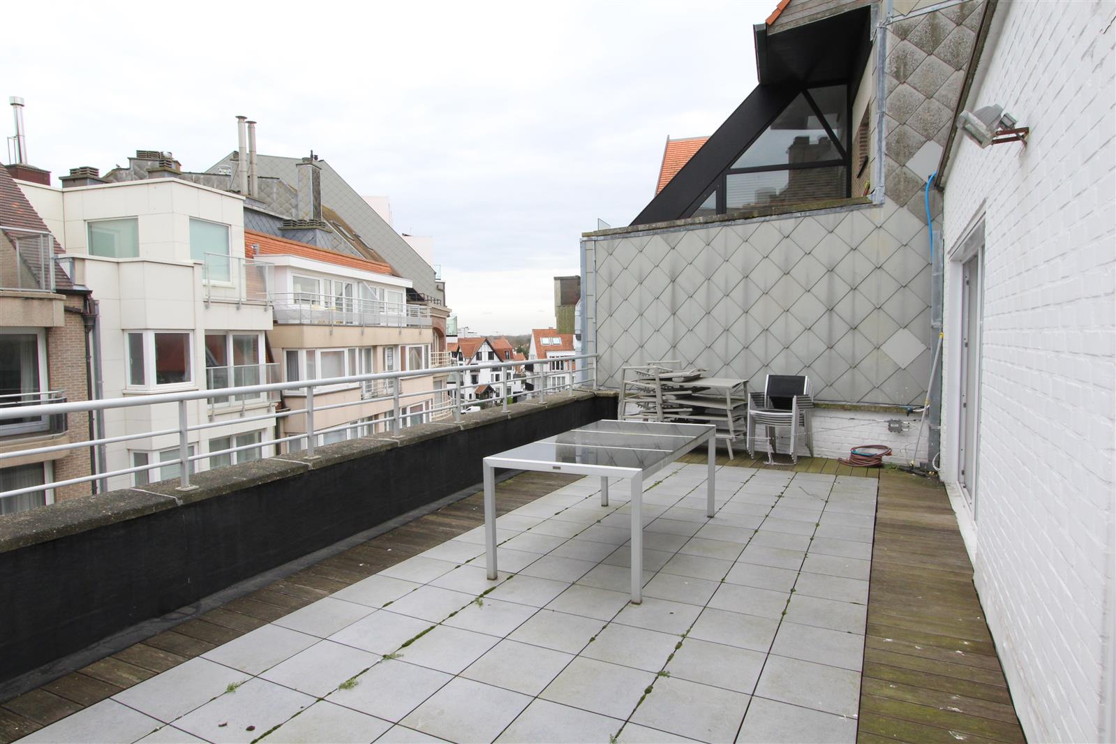 Deze gezellige penthouse bevindt zich in de buurt van het Albertplein en beschikt over een groot terras vooraan waar u kan genieten van een uitgestrekt zijdelings zeezicht. Garagebox inbegrepen.